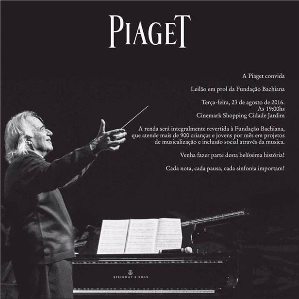 O evento terá lugar no Espaço Cinemark do Shopping Cidade Jardim, no próximo dia 23 de agosto, terça-feira, às 19 horas. O modelo Altiplano foi especialmente gravado em tributo ao maestro, o que torna a peça ainda mais exclusiva. O relógio a ser leiloado leva a numeração 2/2. A peça 1/2 (exatamente igual) foi presenteada ao maestro pela Piaget.