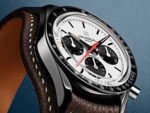 Pequenos segundos às 2:30, contador de décimos de segundo às 6 e contador de minutos às 9:30, data às 4