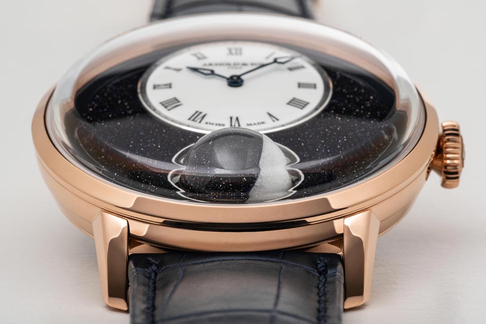 A Arnold & Son apresentou no Watches & Wonders 2021 o espetacular Luna Magna, com uma Lua esférica de 12 mm de diâmetro, a maior já criada para um relógio de pulso, feita de mármore e aventurina!
