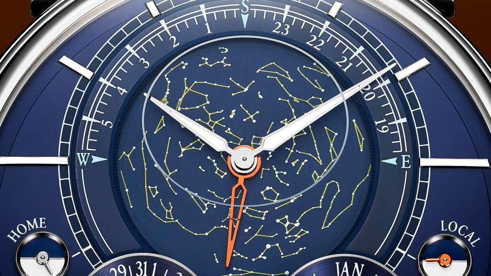 Um dos mostradores, predominantemente em tons de azul, oferece uma jornada sideral, além das essenciais referências de tempo e calendário. A simetria do mostrador, que garante a legibilidade das indicações, esconde a complexidade de sua construção, composta por 22 peças. O contador de horas e minutos descentralizado também exibe um mapa celeste do Hemisfério Norte. Ao girar, ele reproduz o movimento das constelações de acordo com a duração de um dia sideral, marcada na periferia. Tomando uma estrela fixa no céu como ponto de referência, o tempo que a Terra leva para completar uma rotação de 360°, ou dia sideral, é exatamente 23 horas, 56 minutos e 4 segundos. Como a Terra gira em torno de seu eixo ao mesmo tempo em que orbita o Sol, leva aproximadamente quatro minutos a menos que um dia do calendário para retornar ao seu ponto original em relação à estrela em questão. Uma elipse de cor clara destaca o que o observador pode ver em tempo real.