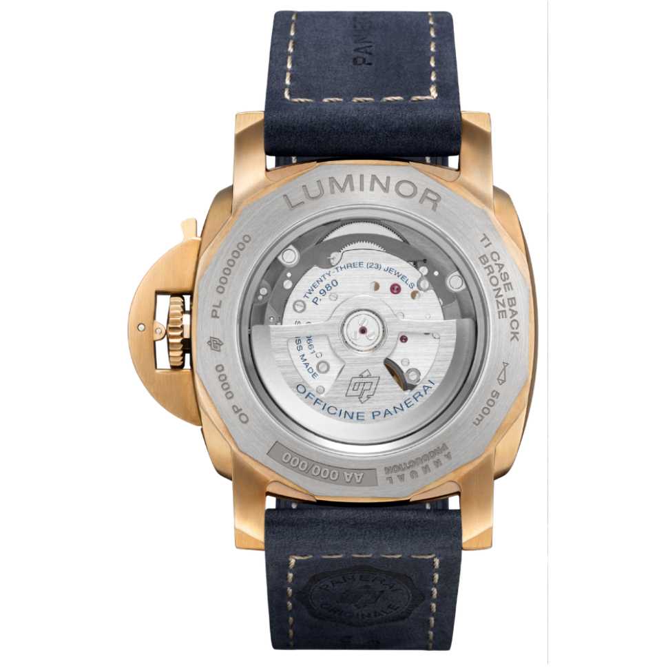 O fundo transparente em safira proporciona a visão do novo calibre P.980, um movimento automático com reserva de marcha de 3 dias, desenvolvido para uma medição precisa do tempo. Este movimento apresenta uma ponte de balanço transversal, que aumenta a estabilidade contra possíveis choques. Uma função de parada do segundo permite o ajuste preciso da hora, interrompendo o ponteiro dos segundos quando a coroa é puxada. Demonstrando ainda mais seu compromisso com a precisão, o P.980 passou por rigorosos testes em seis posições para garantir um desempenho cronométrico confiável e opera em uma frequência projetada para manter uma medição do tempo consistente e precisa durante uso prolongado. O PAM01678 exibe o design de caixa modernizado da nova coleção Luminor Marina, onde as proporções mais elegantes do calibre, de 12½ linhas, garantem uma experiência confortável e ergonômica no pulso, preservando a identidade marcante do relógio.