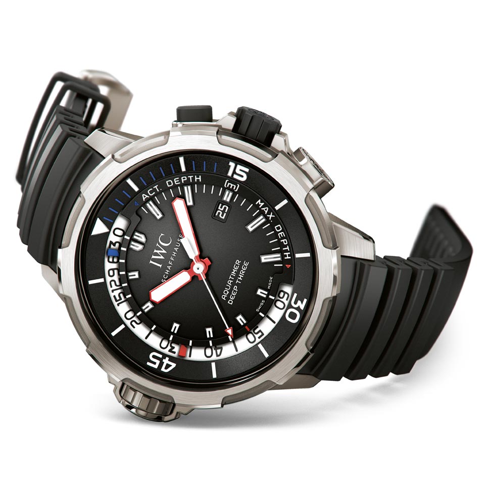 O Aquatimer Deep Three, apresentado no SIHH 2014, é a terceira geração de relógios para mergulho IWC com profundímetro mecânico.
