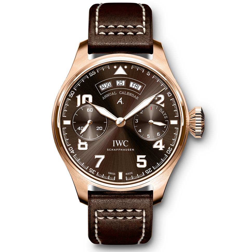 O Big Pilot's Watch Annual Calendar Edition "Antoine de Saint Exupéry" é a mais recente edição especial criada para homenagear o piloto e escritor Francês. A edição é limitada a 250 peças em ouro vermelho 18 K com mostrador marrom e ponteiros dourados.