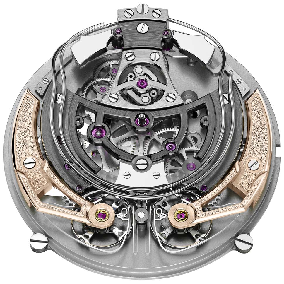 Movimento de manufatura a corda manual calibre Armin Strom ARR18, criado em colaboração com Le Cercle des Horlogers Sistema regulador com dois órgãos reguladores independentes conectados por uma mola de acoplamento de ressonância patenteada Pontes dos balanços em ouro rosa Reserva de marcha: 96 horas Dimensões: 39,40 x 11,35 mm Frequência: 25.200 aph (3,5 Hz) 408 componentes, 51 rubis Indicação de horas e minutos descentrados, repetição de minutos
