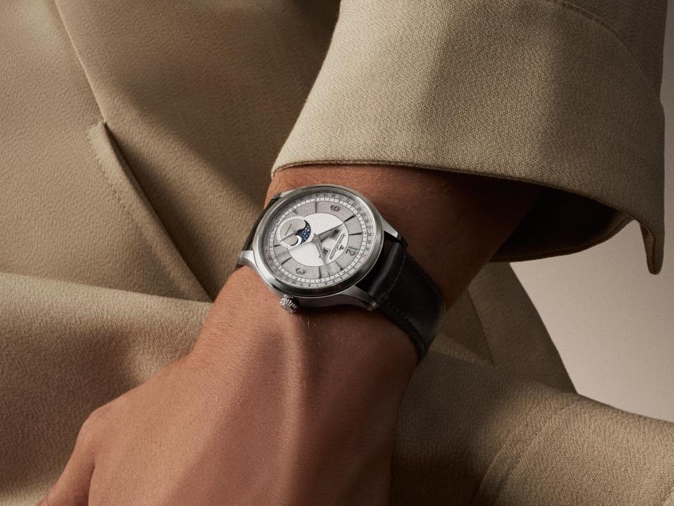 O efeito bicolor do novo mostrador granulado cria uma versão visualmente atraente e com alta legibilidade desse layout clássico, com indicações divididas em seções distintas, marcadas por tons alternados de cinza-claro e cinza-escuro. No centro de tom mais claro, as janelas de dia e mês estão posicionadas na parte superior, com indicações pretas decalcadas em discos brancos.