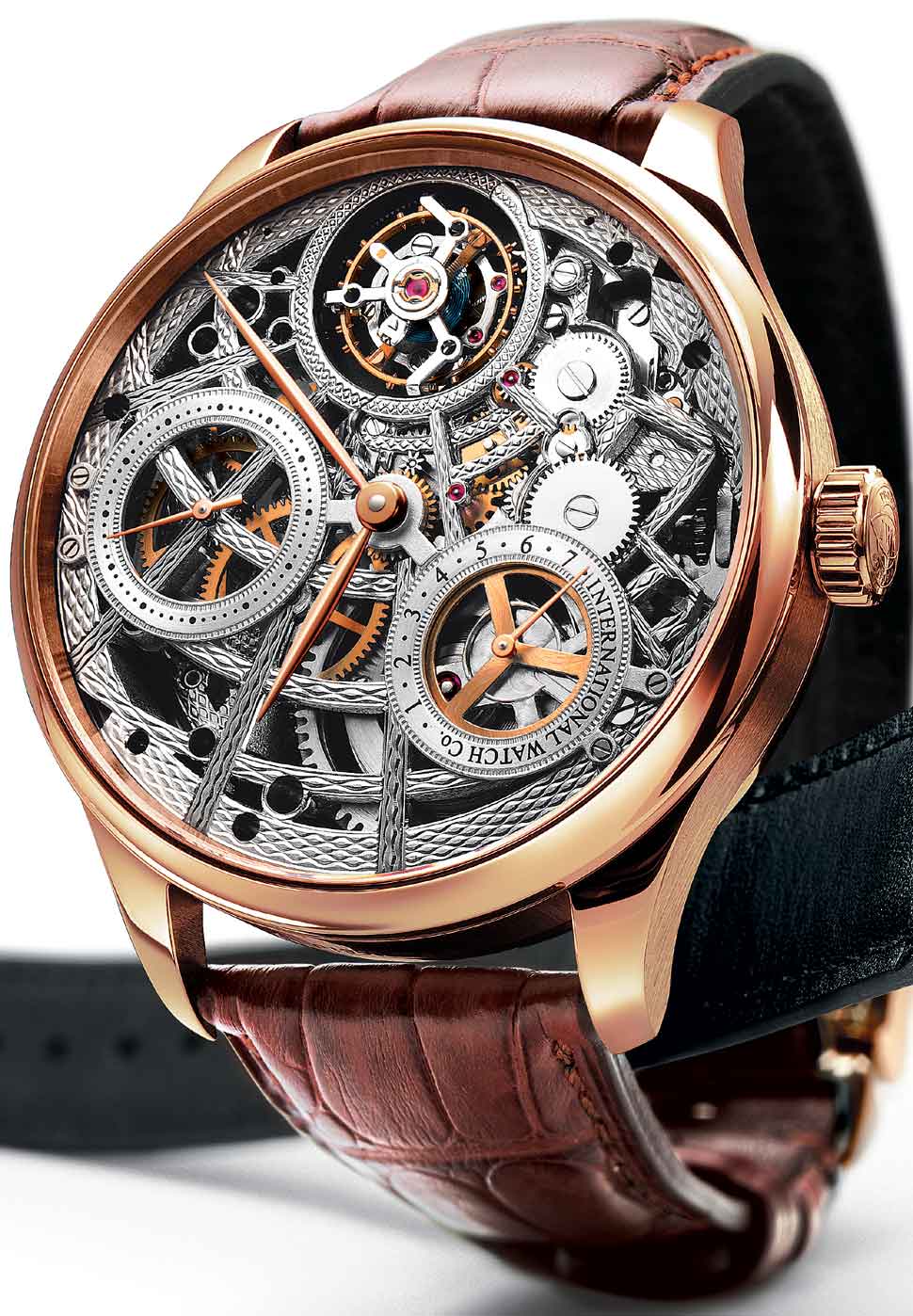 Um impressionante exemplo do sucesso da combinação da arte do relojoeiro com a arte do acabamento é o turbilhão, que gira em uma janela gravada à mão no mostrador do novo modelo. Fiéis ao seu espírito clássico, os engenheiros da IWC projetaram uma carruagem que gira sobre seu eixo uma vez por minuto e acomoda o escapamento com sua espiral Breguet e o balanço parafusado. Este turbilhão dita o ritmo em uma posição atraente: o turbilhão funciona como um "12 animado". Ele é apoiado apenas em seu lado inferior, o que dá a ilusão de flutuar. Este é um importante feito técnico, bem como é o fato de que ele pesa não mais que 0,443 g, a despeito de ter 81 peças individuais. Esta montagem filigranada não deixa ao observador nenhuma dúvida do porquê de o turbilhão ainda ser considerado o ponto máximo da relojoaria.