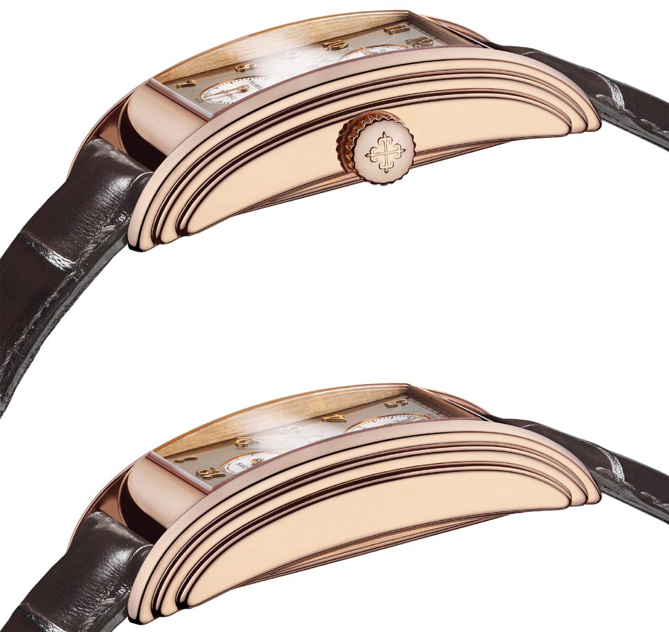 Um incomparável movimento como o calibre 28‐20/222 merece uma caixa digna de sua intrínseca engenhosidade. O marcante formato retangular no estilo "art deco" é reminiscente dos inigualáveis clássicos dos anos 1920 e 1930. Com suas laterais polidas em três camadas, ela é a mais pura expressão de elegância. O caloroso tom do ouro rosa 18K agora faz aumentar ainda mais a fascinação deste notável mecanismo. A despeito de seu considerável comprimento de mais de cinco centímetros, a caixa anatomicamente curvada assenta-se suavemente sobre o pulso. Esta curvatura é também acompanhada pelo cristal de safira convexo, conformado de modo a eliminar qualquer efeito de lente ou distorção óptica.