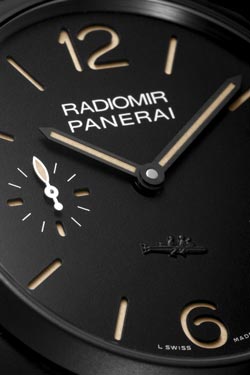 Pela primeira vez, a caixa Radiomir 1940 mostra um acabamento preto fosco, devido ao revestimento DLC sobre a estrutura de aço. O mostrador preto tipo “sanduíche” incorpora motivos gráficos minimalistas.