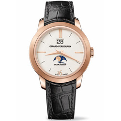 Um verdadeiro clássico da Girard-Perregaux, o movimento mecânico automático inclui indicações de fases da lua e grande data (esta com um sistema patenteado para uma ótima legibilidade, sem nenhuma linha separando dezenas e unidades).
