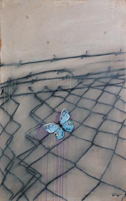 Uma borboleta foi aprisionada no movimento do mais novo relógio da MB&F (Maximilian Büsser & Friends). E sem esperança de escapar, pois o complicado movimento está envolto em arame farpado...