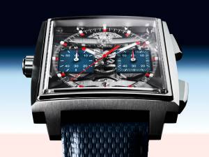 Feita em titânio e aço, com dimensões de 43,8 mm de largura, comprimento de 53,6 mm, espessura de 17,8 mm. Cristais de safira, resistência à água a 30 m/100 atm. Acabamento de superfícies acetinado.