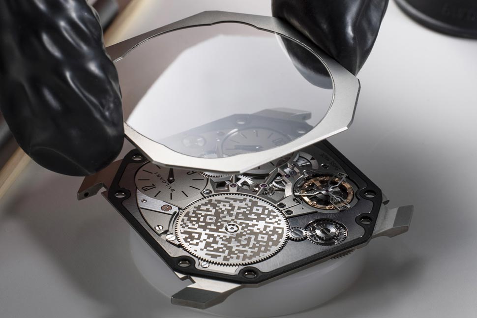 O Octo Finissimo Ultra é mais do que um relógio para ser usado no pulso; é um ecossistema global que abre novos mundos. Sua mecânica desafia as leis da física e se estende a um mundo não físico. O código QR gravado no tambor é uma porta de entrada para uma jornada de descoberta na qual cada proprietário encontrará um mundo dedicado ao seu relógio, seu design e sua história. Este espaço exclusivo contará com entrevistas, segmentos de making-of, um tour virtual 3D do movimento e uma exploração do conceito de visível/invisível ligado ao relógio.