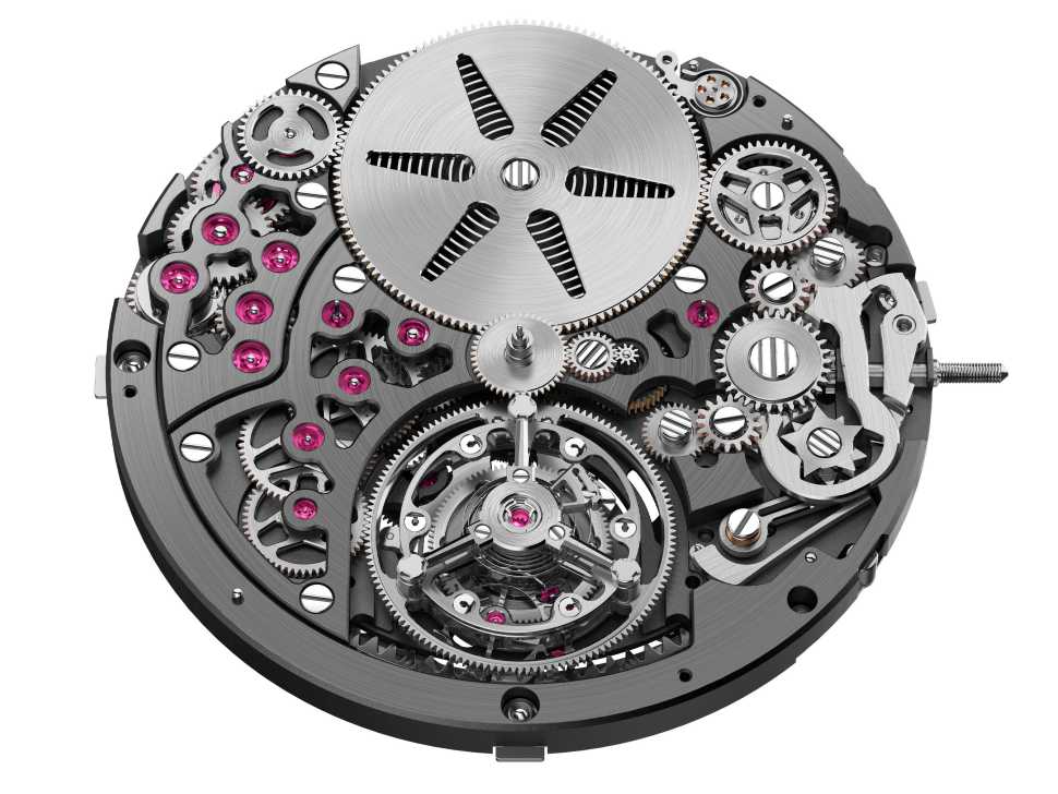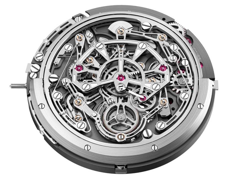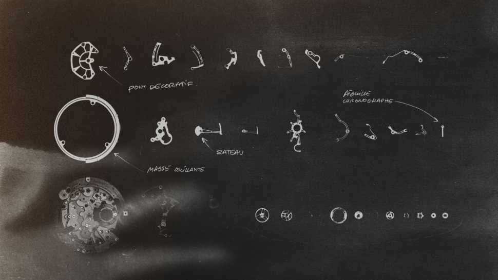 Engenheiros internos desenvolveram um novo mecanismo patenteado que otimiza a energia tanto do movimento quanto dos botões de curso curto e baixa força. Essa inovação se baseia em um mecanismo de cremalheira e pinhão, projetado para substituir o martelo e o coração convencionais. Ao armazenar energia na cremalheira, esse dispositivo mantém o conjunto de engrenagens sob tensão e evita que o ponteiro do cronógrafo vibre, eliminando a necessidade da mola de fricção encontrada nos cronógrafos contemporâneos - um componente que atua como um freio constante durante a operação e no reset. O resultado é um consumo de energia semelhante, mas a energia agora é armazenada em vez de dispersa.