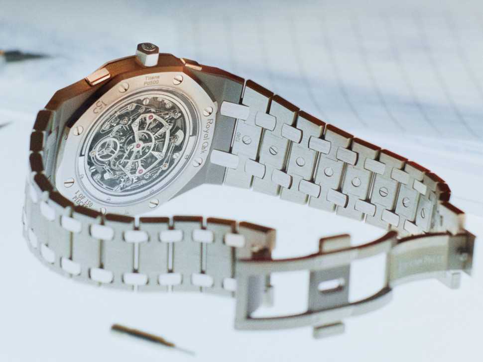 Para realçar o perfil fino do modelo, as equipes da AP optaram por revestir a caixa e a pulseira integrada com materiais inovadores, combinando a leveza do titânio com a resistência do BMG (Vidro Metálico em Massa). Descobertas na década de 1960, as BMGs são ligas metálicas que, quando resfriadas rapidamente, adquirem propriedades semelhantes às do vidro, como alta resistência e estrutura amorfa. Compostas por mais de 50% de paládio, as BMG exclusivas da Audemars Piguet oferecem excepcional resistência ao desgaste e à corrosão, além de um brilho reflexivo característico. Apresentadas pela primeira vez em 2021 com o exclusivo Royal Oak "Jumbo" Extra-Thin (ref. 15202XT) criado para a Only Watch, o material entrou na coleção em 2023.