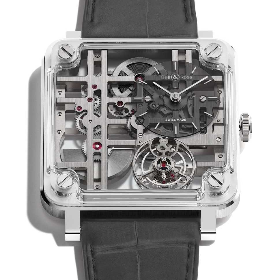 A caixa quadrada, uma caraterística distintiva da Bell & Ross, sofre aqui uma transformação radical. Nesta nova interpretação, o aço e a safira combinam-se para criar uma arquitetura totalmente transparente e minimalista, na qual cada elemento estrutural contribui para revelar o movimento. A construção baseia-se num princípio ousado: a caixa e o movimento já não são duas entidades separadas, mas sim um todo inseparável, estruturalmente ligado. Três componentes permitem alcançar essa alquimia: uma caixa central em aço, uma parte superior em safira e um fundo em safira, mantidos juntos por quatro parafusos. Essa aparente simplicidade esconde uma grande proeza técnica, já que a safira, um material de excepcional dureza, requer um domínio absoluto tanto na usinagem quanto na montagem.