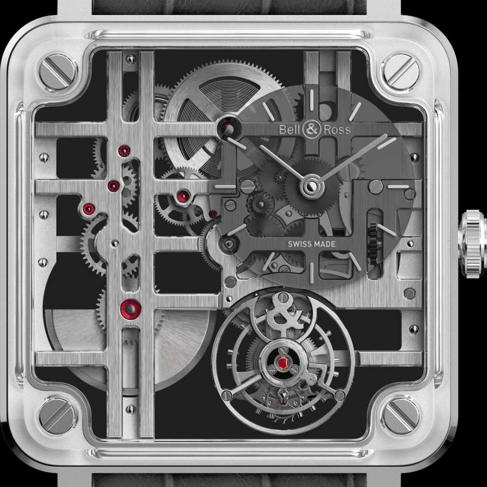 "A safira realça a beleza da mecânica de precisão", afirma Bruno Belamich. Esta transparência máxima oferece uma visão completa do movimento, transformando o relógio num objeto de contemplação no qual é possível ver todas as pontes, rodas e rubis. A estética do esqueleto inspira-se em dois mundos artísticos aparentemente distantes, unidos por uma busca comum pela pureza. Por um lado, a abstração geométrica de Piet Mondrian, com as suas linhas ortogonais e divisões espaciais rigorosas. Por outro, a funcionalidade refinada de Charlotte Perriand, cujas criações arquitetônicas celebram o essencial. Esta dupla referência manifesta-se numa grade precisa, numa geometria rigorosa que estrutura o movimento como uma obra de arte visual. A arquitetura do movimento reflete a grade geométrica tão apreciada pela Bell & Ross. As linhas retas horizontais e verticais estruturam o espaço mecânico numa composição rigorosa.