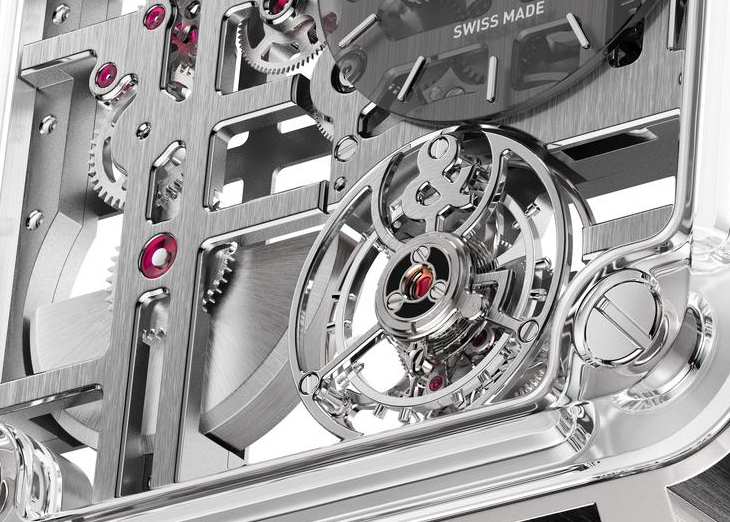 A estrutura quadrada ecoa a caixa, criando uma continuidade visual entre o recipiente e o conteúdo. Os 26 rubis, pedras tradicionais da relojoaria, acentuam essa geometria com seu profundo brilho vermelho. "A leitura das horas é reduzida à sua expressão mais simples. O movimento também, despojado de excessos, respeitando a grade", resume Bruno Belamich. De fato, apenas são mostradas as horas e os minutos, deslocados para as 2 horas. Esta simplificação deliberada liberta espaço para a mecânica, estabelecendo uma nova hierarquia em que o tempo é secundário. Os acabamentos refletem a excelência artesanal: pontes escovadas com reflexos lineares, bordas polidas que definem os contornos com precisão cirúrgica. Cada superfície e cada ângulo contribuem para a beleza geral. É a expressão do minimalismo relojoeiro, onde a beleza surge do vazio e a pureza do gesto mecânico se torna o único adorno.