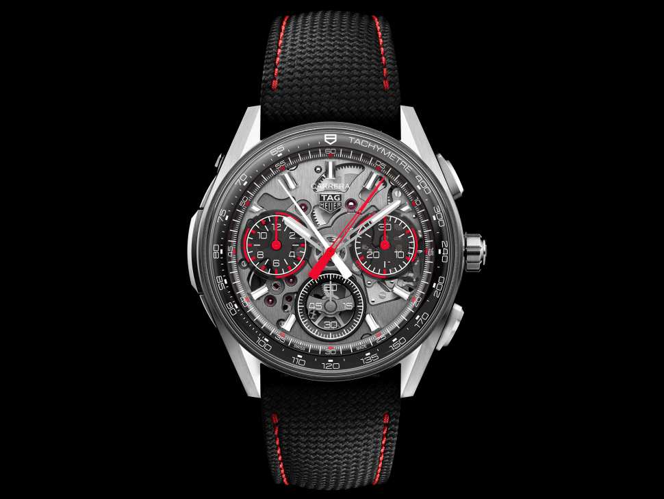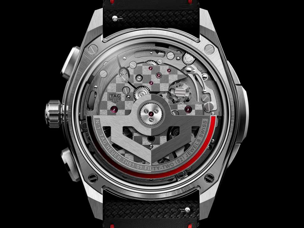 O fundo em safira foi cuidadosamente projetado para permitir ao proprietário admirar o movimento extraordinário de todos os ângulos, seguindo o mesmo código visual da impressão de "movimento flutuante" introduzido no TAG Heuer Monaco Split-Seconds Chronograph.