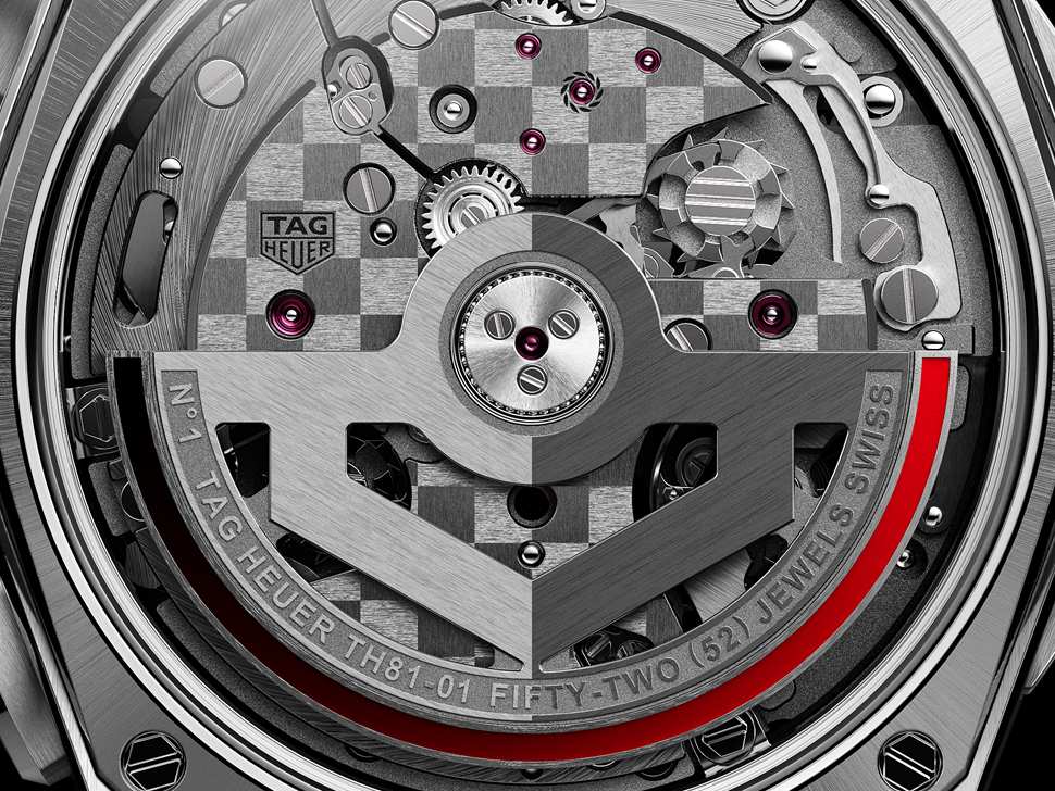 Rigorosamente testado no laboratório da TAG Heuer, o movimento não é apenas um testemunho de durabilidade e precisão; ele representa o melhor do savoir-faire da relojoaria suíça. O calibre TH81-01 é composto por mais de 350 componentes individuais, todos finalizados à mão com o uso de mais de 10 técnicas diferentes, incluindo polimento negro (black polishing) para diversos elementos, como os parafusos, além de anglage aplicado a múltiplas partes.