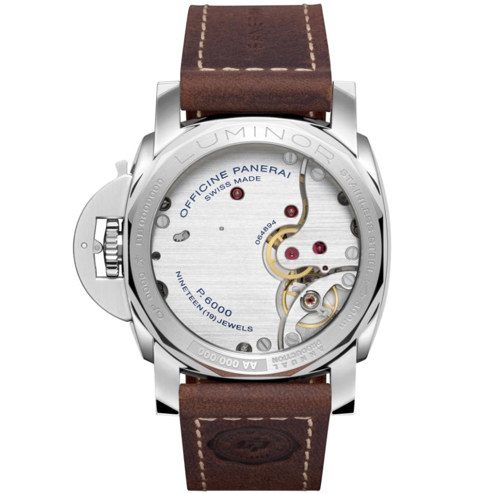 Ambas as novidades compartilham especificações essenciais que definem seu caráter vintage. A caixa de aço de 44 mm é complementada por um cristal de safira abaulado, uma escolha de design que remete ao efeito visual do Perspex usado nos relógios Luminor da década de 1960. Esse detalhe aprimora tanto a profundidade quanto a legibilidade, em uma homenagem aos primeiros instrumentos profissionais da Maison. O fundo em safira revela o calibre P.6000 a corda manual, movimento de Manufatura com reserva de marcha de três dias. O P.6000 mede 151⁄2 linhas de diâmetro e apresenta um balanço que oscila a 21.600 alternâncias por hora, fixado por uma ponte transversal para maior estabilidade do órgão regulador. Para um ajuste preciso da hora, o calibre inclui uma função de parada de segundos. Esse mecanismo útil é ativado quando a coroa de corda é puxada para a segunda posição: uma lâmina de mola interrompe o balanço, que por sua vez para o ponteiro de segundos no mostrador, garantindo uma sincronização de tempo altamente precisa.