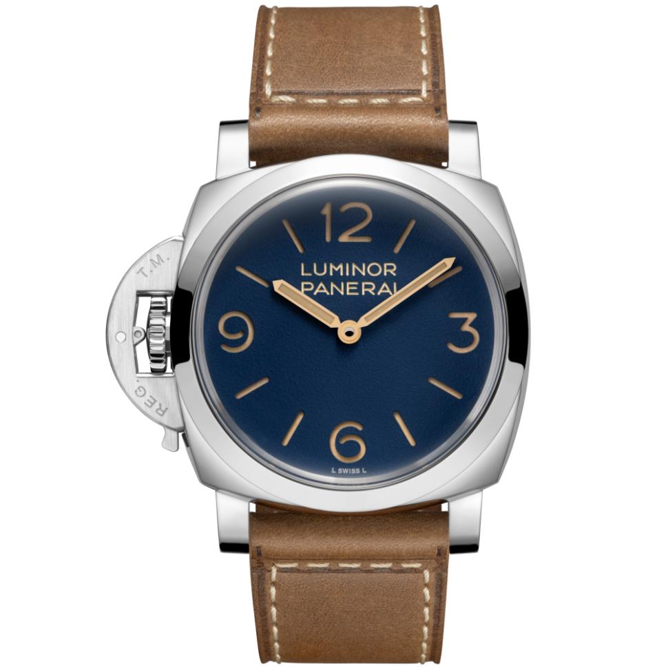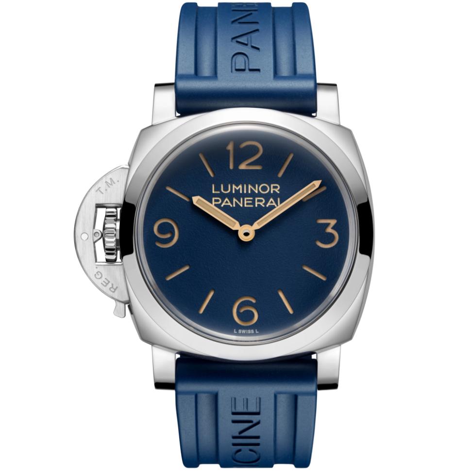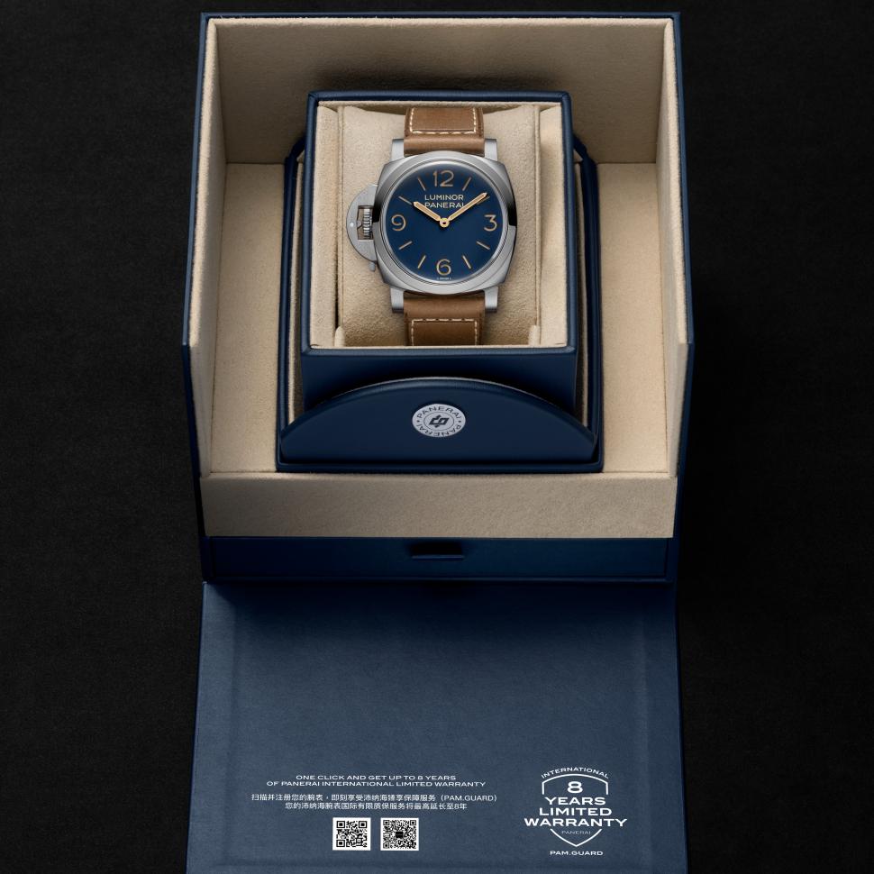 O Luminor Destro PAM01732 apresenta a ponte protetora da coroa no lado esquerdo da caixa, inspirada em modelos originalmente concebidos para auxiliar mergulhadores militares, liberando a mão esquerda para o uso de instrumentos como bússola ou medidor de profundidade. Giuseppe Panerai idealizou essa configuração especificamente para aprimorar as capacidades dos mergulhadores militares durante suas missões, permitindo que o relógio seja usado no pulso direito, com a ponte protetora da coroa garantindo conforto e facilidade de uso durante operações subaquáticas. O mostrador azul fosco exibe os numerais 12, 3, 6 e 9 e uma exibição limpa, sem pequenos segundos, oferecendo uma interpretação distinta dos códigos visuais do Luminor. O relógio é acompanhado por uma pulseira reta em couro de bezerro marrom claro em estilo vintage e uma segunda pulseira em borracha azul.