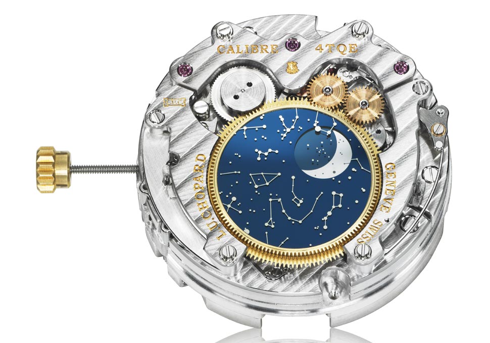 Com certificado de cronometria COSC e gravado com o prestigioso Selo de Genebra, o calibre L.U.C 4TQE integra 4 barriletes para uma reserva de marcha de 7 dias. Apresenta as indicações de horas, minutos, pequenos segundos sobre o turbilhão, calendário perpétuo com indicação de 24 horas, dia da semana, data, mês, ano bissexto, reserva de marcha, indicação de 24 horas, equação do tempo, hora do amanhecer, hora do anoitecer e fase da lua. O calibre L.U.C 4TQE possui 516 componentes e 42 rubis e se move a uma frequencia de 28.800 alternâncias/hora.