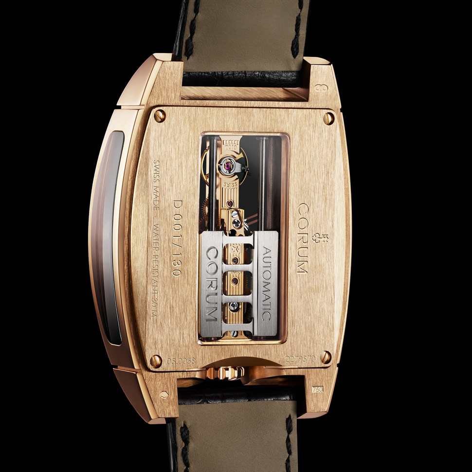 O novo e exclusivo calibre Corum CO313 exigiu mais de quatro anos de pesquisa e desenvolvimento para adequação dos materiais, das forças de atrito e dos coeficientes de carga. Dotado de uma massa oscilante linear em platina, visível em ambas os lados da caixa e de um mecanismo com brida deslizante, este movimento Golden Bridge bate a uma frequência de 4 Hz, 28.800 alternâncias/hora, para uma reserva de marcha de 40 horas. Integrando 194 componentes, o calibre CO313 está dotado de um balanço de inércia variável, garantia de alta precisão a longo prazo, e de um tambor miniaturizado para não romper a verticalidade do conjunto. A platina e as pontes são de ouro 18 quilates, combinando com o ouro da caixa, com uma nova decoração guilloché vertical para acompanhar o movimento da massa e para destacar ainda mais o caráter deste movimento linear.