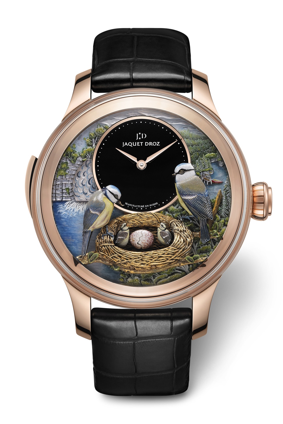 Em um espetáculo visual marcante, o "Bird Repeater" representa dois Chapim-Azul da região do Jura da qual Jaquet-Droz era nativo, em um ninho com as suas crias. Em outro aceno às origens da Manufatura, as quedas de água de Saut du Doubs também marcam presença sobre o mostrador deste novo tesouro relojoeiro.