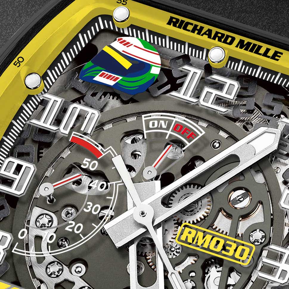 Além disso, o capacete do piloto de Fórmula 1 Felipe Massa, que também é parceiro da marca Richard Mille, surge no mostrador às 11 horas. O relógio possui caixa de nanotubos de carbono preto e uma pulseira de borracha preta.