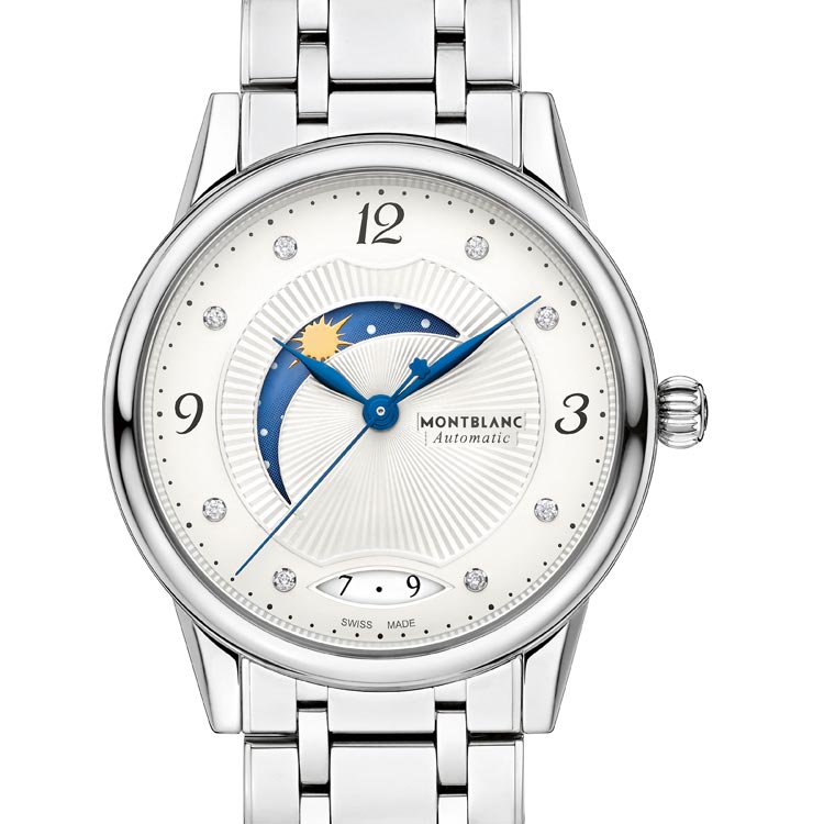 Caixa Aço, aro com 72 diamantes Top Wesselton (~ 0,533 ct) Vidro de safira, convexo, com antirreflexo, fundo em aço com safira Diâmetro 34 mm, altura 9,53 mm, estanque a 3 atm Coroa em aço com o emblema Montblanc em relevo Mostrador branco prateado com guilloché, algarismos arábicos pretos, ponteiros azulados em folha e bastão