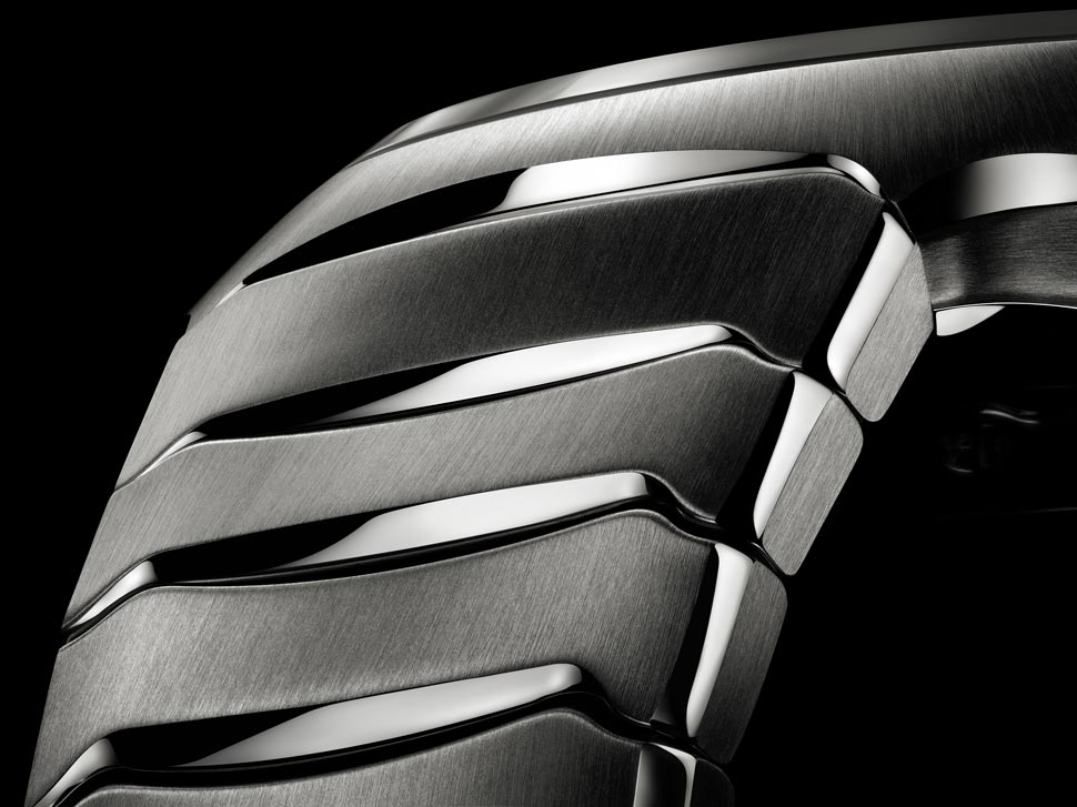 As linhas da caixa se prolongam no bracelete de aço integrado, que se curva elegantemente para adaptar-se à forma do pulso; o exclusivo desenho dos elos garante um ajuste perfeito mesmo nos pulsos mais finos. De fabricação muito complexa, este bracelete apresenta linhas bastante fluidas, baseadas em formas orgânicas.