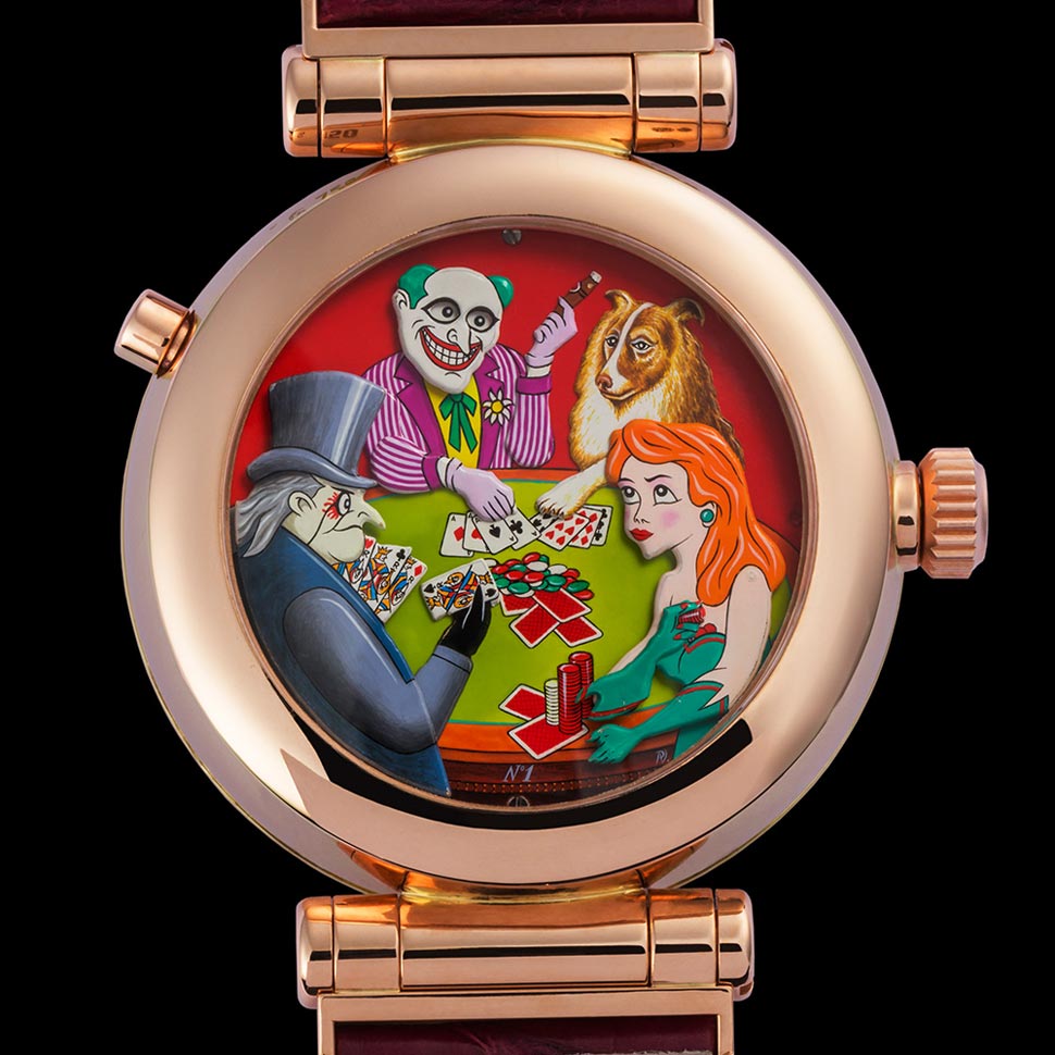 Já o Joker de Chaykin indica as horas como nenhum outro relógio, graças aos olhos do Coringa e à fase da lua exibida pela sua boca! No Automaton Joker, o Coringa foi colocado para jogar pôquer com um dos cães! Para sublinhar esta colaboração, o logotipo de ambos pode ser visto no mostrador.