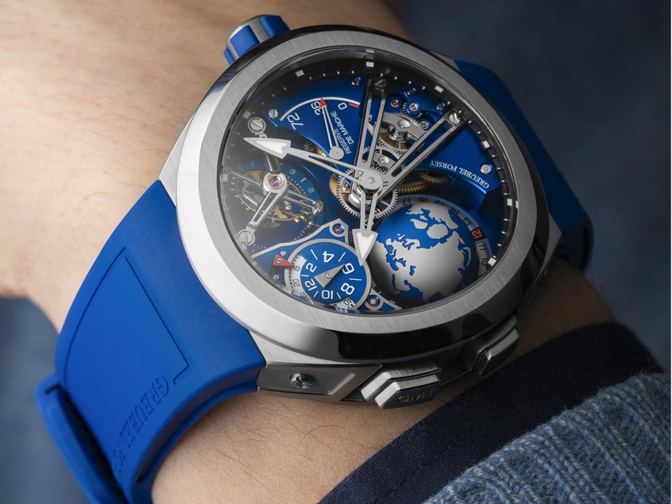 O movimento do novo GMT Sport é o primeiro em uma cor unificada: a platina principal, as pontes, o globo, o mostrador do segundo fuso horário e o anel indicador de 24 segundos do Tourbillon 24 Secondes à 1 hora têm todos o mesmo acabamento azul.