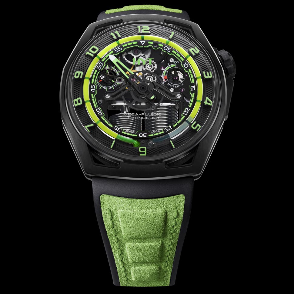 O relógio traz um cristal de safira convexo, oferecendo uma visão desobstruída do mostrador. A peça central do mecanismo meca-fluídico é o sistema de fluidos, com dois reservatórios centrais em "fole". O fluido colorido desempenha a função de indicar as horas retrógradas. Os componentes do movimento mecânico a corda manual revelam-se sutilmente através da parte de trás do mostrador.