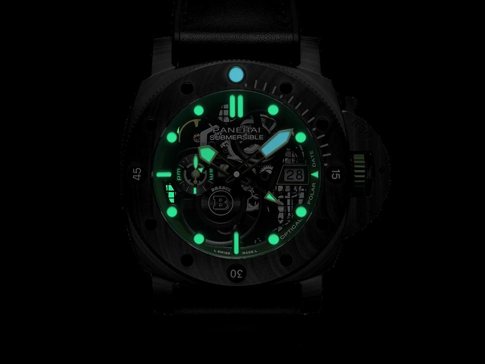 Disponível em edição limitada de 200 peças, o Submersible S Brabus Verde Militare traz uma caixa de 47 mm em Carbotech, material usado pela primeira vez na alta relojoaria pela Panerai, mais leve que o aço ou o titânio e resistente à corrosão. Nuances em verde militar distinguem esta referência, aparecendo nos ponteiros, flange, coroa emborrachada, indicador am/pm e pequenos segundos. Enquanto isso, a presença do logo Brabus no protetor de coroa e mostrador afirma o caráter colaborativo do relógio.