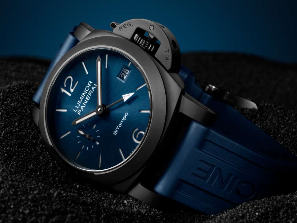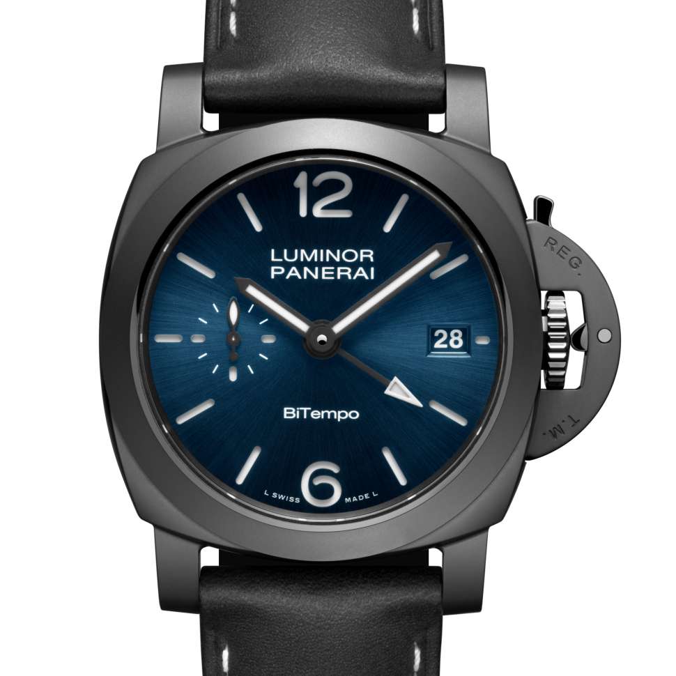 Além da impressionante combinação de caixa preta e mostrador azul, o PAM01783 oferece legibilidade aprimorada graças ao SuperLumiNova X2 branco nos numerais, marcadores e ponteiros. Uma sutil referência à herança italiana da Panerai é a inscrição "BiTempo", o termo italiano para "duplo fuso horário", exibida no mostrador.