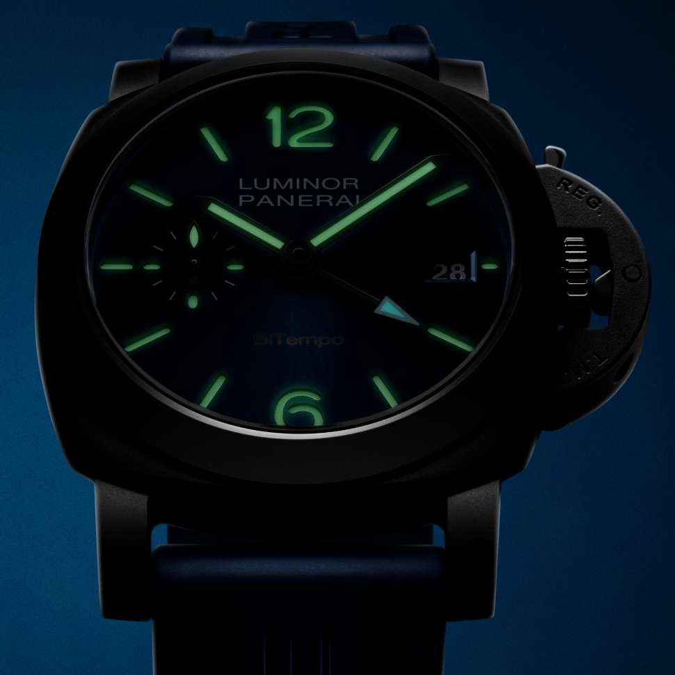 A caixa de cerâmica preta de 40 mm é combinada com uma pulseira de couro de bezerro preta e uma segunda pulseira de borracha azul, equipada com o sistema PAM Click Release tanto na pulseira quanto na fivela, que dispensa o uso de ferramentas para trocas fáceis, tornando-a versátil para diversas ocasiões e estilos.