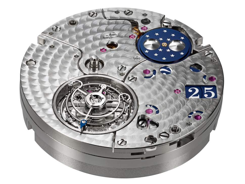 Funções: horas, minutos, pequenos segundos, turbilhão volante, fase da lua, data panorâmica