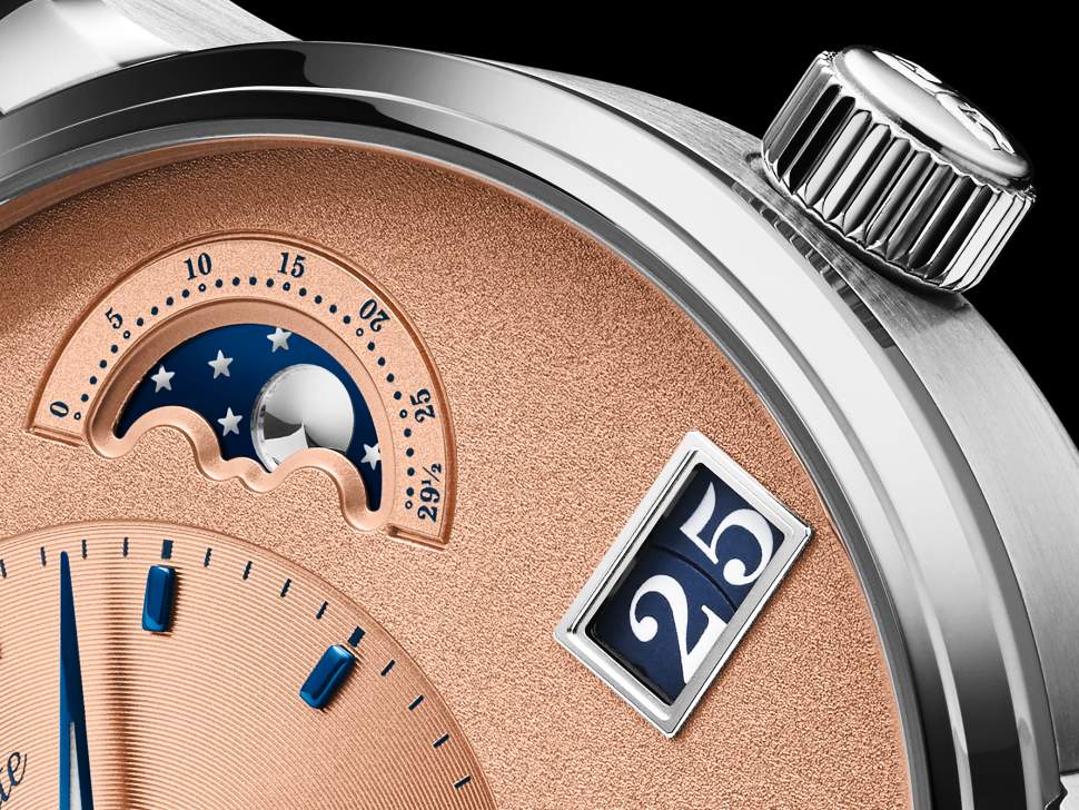 Outra "especialidade" local pode ser encontrada às 4 horas: a data panorâmica, característica marcante de muitos modelos Glashütte Original. Numerais brancos sobre fundo azul são exibidos, sem barra central de separação, em dois discos concêntricos montados no mesmo plano. O indicador curvo da fase da lua está posicionado às 2 horas. Ao longo de muitos anos, a Glashütte Original aperfeiçoou esta popular complicação, a ponto dela se tornar uma característica distintiva da marca. A esplêndida representação de um céu noturno em miniatura com estrelas prateadas sobre um fundo azul escuro também é produzida na oficina de mostradores da própria marca.