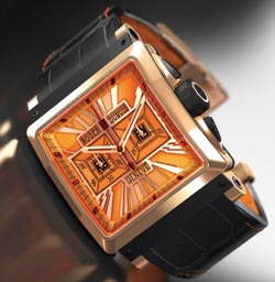 Caixa quadrada de 40 mm de ouro rosa, estanque até 5 atm. O mostrador com fundo laranja tem números romanos de ouro rosa em esqueleto, com realce em laranja brilhante, minuteria em cinza antracito, 1 granada vermelha central, 12 sobre o realce.