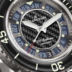 "Esta peça foi chamada de 500 Fathoms," diz Lionel a Marca, Vice-presidente Técnico da Blancpain, "porque ele resiste a uma profundidade de 1.000 metros - aproximadamente 500 fathoms (914,5 m). O aro serrilhado facilita o manuseio, enquanto seu sistema de rotação unidirecional evita qualquer extensão inadvertida do tempo de mergulho. Feito de titânio e safira, o aro é levemente curvado para protegê-lo de impactos."
